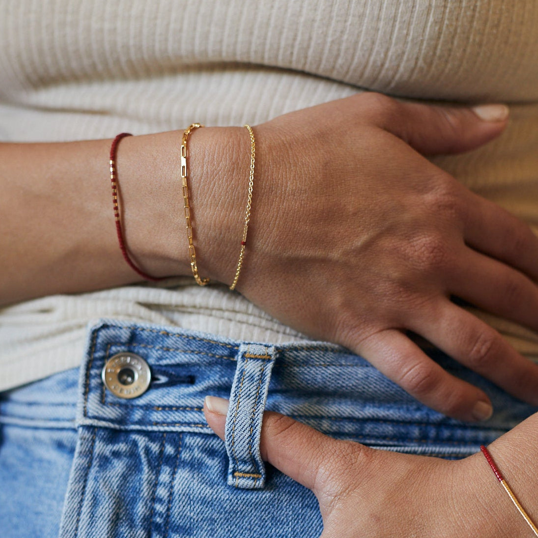 צמיד זהב 14k עם אלמנט עשוי בעבודת יד מחרוזי זהב וחרוז בודד אדום.