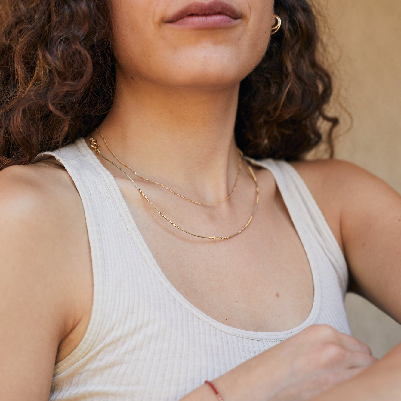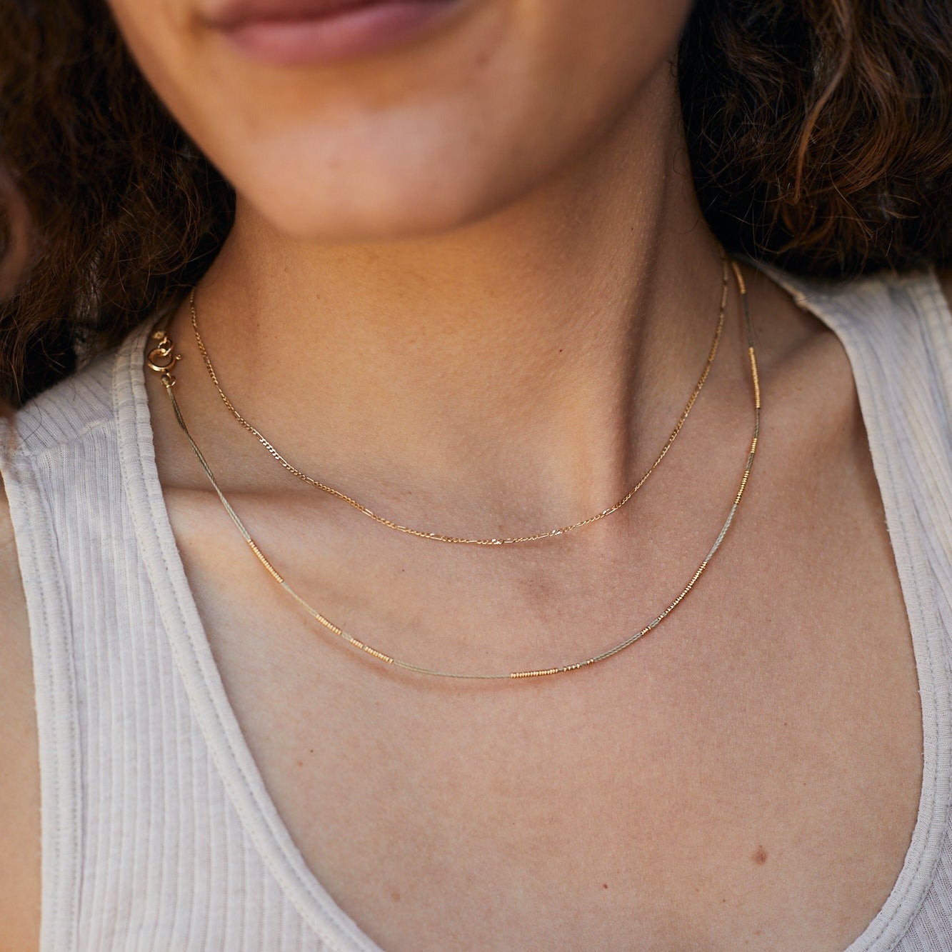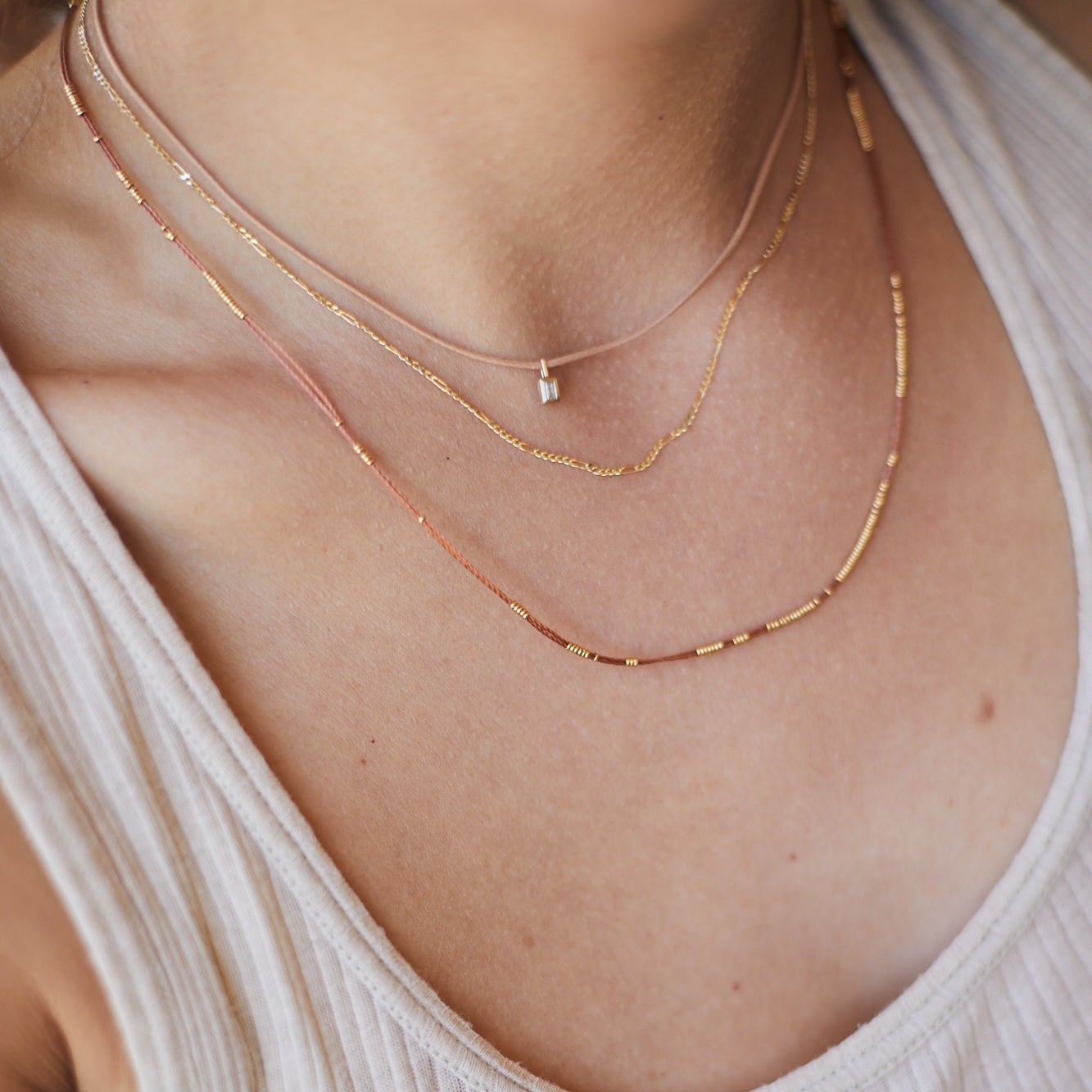 שרשרת חוט של ביז'ו, עדינה אך מושכת את העין. עשויה מחוט חזק ועמיד, מיוצרת בעבודת יד ייחודית בסטודיו שלנו.